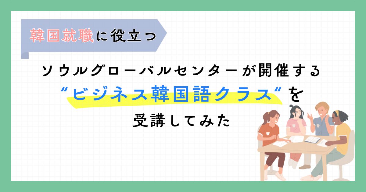 当サイトの人気記事Popular Post 新着記事New Post 【韓国就職に役に立つ!】ソウルグローバルセンターが開催する“ビジネス韓国語クラス”を受講してみた 2025.11.15 韓国生活 韓国生活 maiワーホリ、留学を経て韓国に移住しました!Profile韓国在住の日本人maiです。 韓国人の方と結婚し、現在結婚ビザ(F-6)を準備中です! 韓国の生活や現地のリアルな出来事など日記のように綴っていきます✍ また日韓カップルや日韓夫婦の方のお役に立てるような情報も発信していこうと思っています⭐ ゆっくり見て行ってください☺